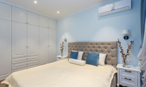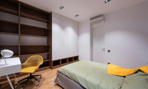 Efficient storage solutions with elegant built-in cupboards for bedrooms.